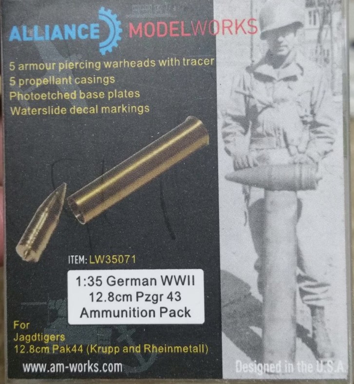 1/35 German WWII 12.8cm Pzgr.43 Ammunition Pack (5pcs) – Alliance Model Works LW35071 Manufacturer: Alliance Model Works Availability: In stock SKU: Alliance Model Works LW35071 This 1/35 scale 12.8cm Pzgr.43 ammunition set from Alliance Model Works adds realistic heavy-caliber rounds to late‑war German armor and artillery displays, enhancing accuracy and visual depth. Old price: $17.99 Price: $12.00 Qty: Add to cart Custom wishlist OK Add to wishlist Email a friend Shares: The Alliance Model Works German WWII 12.8cm Pzgr.43 ammunition pack provides five highly detailed armor‑piercing rounds for late‑war German heavy weapons in 1/35 scale. Designed with accurate dimensions and crisp detail, this set is ideal for enhancing King Tiger, Jagdtiger, and heavy artillery diorama scenes with realistic ammunition components.\n\nHighlights: Accurate 12.8cm Pzgr.43 ammunition Includes five detailed rounds Ideal for late‑war German heavy armor Enhances realism of dioramas and gun scenes\n\nDetails: Manufacturer: Alliance Model Works SKU: LW35071 Scale: 1/35 Material: Resin / metal components Skill Level: Intermediate to Advanced Products specifications Attribute name Attribute value Scale 1/35