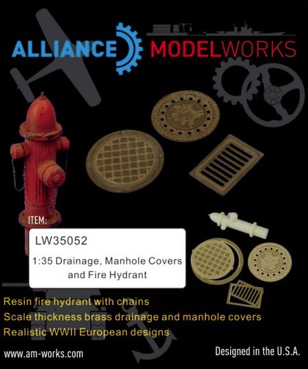 1/35 Drainage Covers, Manhole Covers & Fire Hydrant – Alliance Model Works LW35052 Manufacturer: Alliance Model Works Availability: In stock SKU: Alliance Model Works LW35052 This 1/35 scale urban detail set from Alliance Model Works adds realistic drainage covers, manholes, and a fire hydrant to city-based dioramas, improving environmental authenticity and scene depth. Old price: $19.99 Price: $13.00 Qty: Add to cart Custom wishlist OK Add to wishlist Email a friend Shares: The Alliance Model Works drainage covers, manhole covers, and fire hydrant set provides urban detail accessories for 1/35 scale dioramas. Featuring accurately shaped infrastructure elements, this set is ideal for city streets, industrial scenes, and damaged urban environments commonly depicted in WWII and post-war settings.\n\nHighlights: Urban infrastructure accessories for dioramas Includes drainage covers, manholes, and hydrant Adds environmental realism to scenes Suitable for WWII urban settings\n\nDetails: Manufacturer: Alliance Model Works SKU: LW35052 Scale: 1/35 Material: Resin Skill Level: Beginner to Advanced Products specifications Attribute name Attribute value Scale 1/35