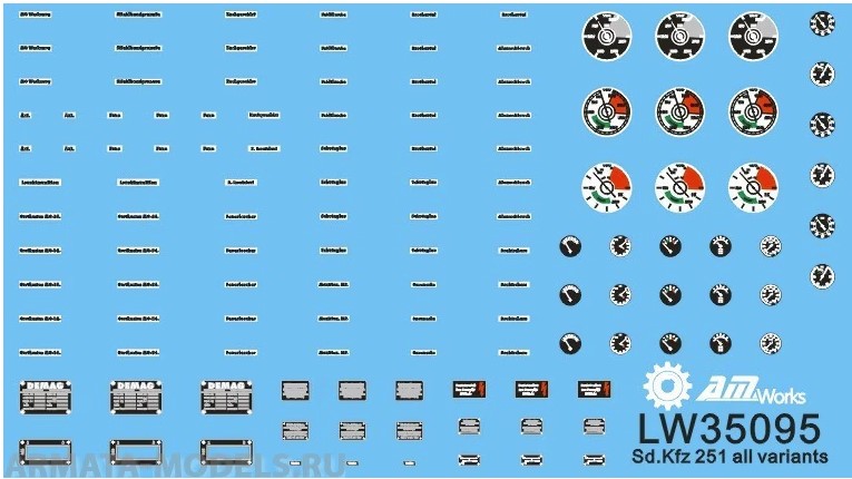 1/35 Vehicle Dials & Placards Sd.Kfz.251 All Variants – Alliance Model Works LW35095 Manufacturer: Alliance Model Works Availability: In stock SKU: Alliance Model Works LW35095 This 1/35 scale Sd.Kfz.251 dial and placard set from Alliance Model Works enhances halftrack interiors with accurate instrumentation and historically correct markings. Old price: $15.99 Price: $10.00 Qty: Add to cart Custom wishlist OK Add to wishlist Email a friend Shares: The Alliance Model Works Sd.Kfz.251 vehicle dials and placards set provides detailed interior instrumentation for all variants of this iconic German halftrack in 1/35 scale. Designed to enhance dashboard and cabin realism, this set adds accuracy and depth to one of WWII’s most widely used vehicles.\n\nHighlights: Interior dials and placards for Sd.Kfz.251 Covers all vehicle variants Improves cockpit and cabin realism Crisp and accurate markings\n\nDetails: Manufacturer: Alliance Model Works SKU: LW35095 Scale: 1/35 Material: Decal / photo‑etched parts Skill Level: Intermediate to Advanced Products specifications Attribute name Attribute value Scale 1/35