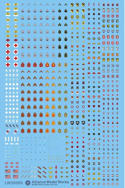 1/35 WWII US Army Insignia Set – Alliance Model Works LW35065 Manufacturer: Alliance Model Works Availability: In stock SKU: Alliance Model Works LW35065 This 1/35 scale WWII US Army insignia set from Alliance Model Works adds historically accurate uniform details to American figures, improving realism for advanced WWII diorama and figure projects. Old price: $19.99 Price: $13.00 Qty: Add to cart Custom wishlist OK Add to wishlist Email a friend Shares: The Alliance Model Works WWII US Army insignia set delivers finely detailed markings and devices for enhancing American soldier figures in 1/35 scale. Designed with historical accuracy in mind, this set improves uniform realism for infantry, vehicle crews, and command figures used in WWII dioramas.\n\nHighlights: Accurate WWII US Army insignia Designed for 1/35 scale figures Enhances uniform realism and detail Ideal for American WWII dioramas\n\nDetails: Manufacturer: Alliance Model Works SKU: LW35065 Scale: 1/35 Material: Resin / photo‑etched metal Skill Level: Intermediate to Advanced Products specifications Attribute name Attribute value Scale 1/35