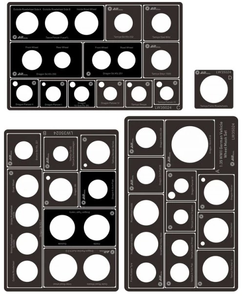 1/35 Wheel Mask Set for WWII German Vehicles – Alliance Model Works LW35024 Manufacturer: Alliance Model Works Availability: In stock SKU: Alliance Model Works LW35024 This 1/35 scale wheel mask set from Alliance Model Works makes painting German WWII vehicle wheels faster and cleaner, delivering professional‑looking results with minimal effort. Old price: $38.99 Price: $26.00 Qty: Add to cart Custom wishlist OK Add to wishlist Email a friend Shares: The Alliance Model Works wheel mask set simplifies painting WWII German vehicle wheels in 1/35 scale. Designed for clean, consistent results, these precision‑cut masks help modelers achieve accurate tire and hub separation while saving time during the painting process. Ideal for tanks, halftracks, and soft‑skin vehicles.\n\nHighlights: Precision wheel masks for German vehicles Improves painting accuracy and consistency Saves time during finishing stages Suitable for multiple WWII vehicle types\n\nDetails: Manufacturer: Alliance Model Works SKU: LW35024 Scale: 1/35 Material: Masking film Skill Level: Beginner to Advanced Products specifications Attribute name Attribute value Scale 1/35 Model Production Year 2014