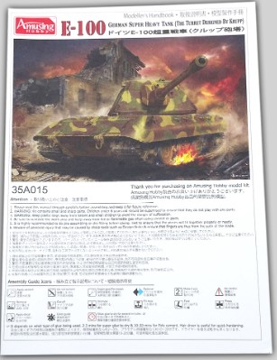 1/35 E-100 German Super Heavy Tank – Amusing Hobby 35A015 Manufacturer: Amusing Hobby Availability: Out of stock Notify me when available SKU: Amusing Hobby 35A015 Amusing Hobby’s 1/35 scale E‑100 super heavy tank model kit captures the scale and ambition of one of Germany’s most legendary armored concepts, providing advanced builders with a striking and rewarding project. Old price: $79.99 Price: $54.00 Custom wishlist OK Add to wishlist Email a friend Shares: The Amusing Hobby E‑100 German Super Heavy Tank represents one of Germany’s most famous late‑war tank concepts in superbly detailed 1/35 scale. Featuring massive armor plates, intricate surface detail, and a historically inspired layout, this kit offers an impressive building experience. Ideal for experienced modelers, the E‑100 delivers both size and realism as a centerpiece display model.\n\nHighlights: Highly detailed 1/35 scale German super heavy tank Accurate E‑100 conceptual design Precision‑molded plastic components Excellent display presence for collections\n\nDetails: Manufacturer: Amusing Hobby SKU: 35A015 Scale: 1/35 Material: Plastic Skill Level: Advanced Products specifications Attribute name Attribute value Country Germany Side Axis Scale 1/35 Model Production Year 2016 Main Weapon 128mm Vehicle Type E-100 German Super Heavy Tank Wars World War II Sub Group Super Heavy Tank Product tags WWII (466) , World War II (24) , Europe (21) , Tracked (18) , Super Heavy Tank (4) , 128mm (4)