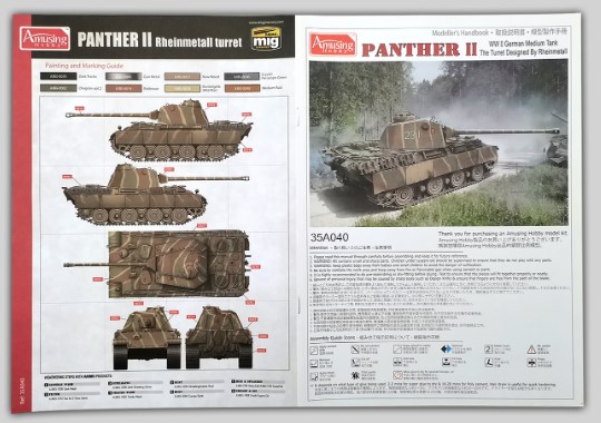 1/35 Panther II Rheinmetall Turret – Amusing Hobby 35A040 Manufacturer: Amusing Hobby Availability: Out of stock Notify me when available SKU: Amusing Hobby 35A040 This 1/35 scale Panther II Rheinmetall turret model kit from Amusing Hobby offers a rare experimental variant, combining detailed engineering with a distinctive and historically interesting design. Old price: $75.99 Price: $55.00 Custom wishlist OK Add to wishlist Email a friend Shares: The Amusing Hobby Panther II with Rheinmetall turret presents a unique experimental configuration in 1/35 scale. This kit highlights an alternate turret design combined with the Panther II hull, accurately reproduced with crisp molding and fine surface detail. Ideal for advanced builders interested in uncommon German design variations.\n\nHighlights: Highly detailed 1/35 scale German experimental tank Accurate Rheinmetall turret design Precision‑molded plastic parts Unique alternative Panther II configuration\n\nDetails: Manufacturer: Amusing Hobby SKU: 35A040 Scale: 1/35 Material: Plastic Skill Level: Advanced Products specifications Attribute name Attribute value Country Germany Side Axis Scale 1/35 Model Production Year 2018 Main Weapon 88mm Vehicle Type Panther II Rheinmetall Turret Wars World War II Sub Group Medium Tank Product tags WWII (466) , 88mm (8) , World War II (24) , Europe (21) , Tracked (18) , Prototype Tank (3)