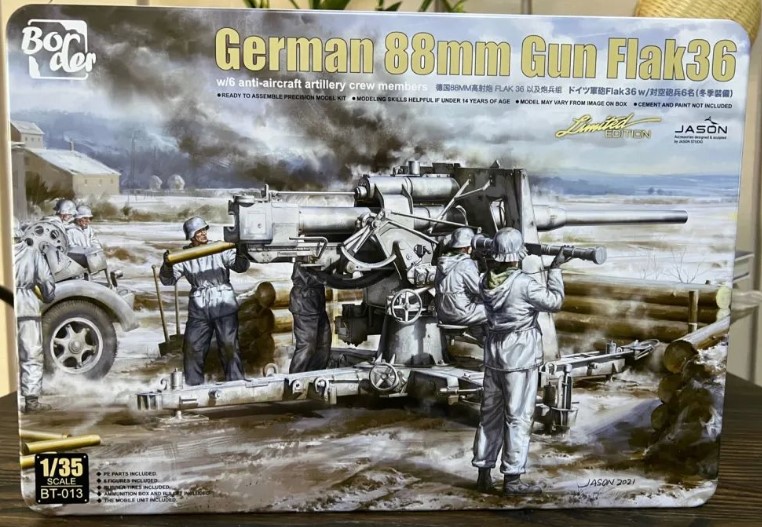 1/35 Flak 36 88Gun Metal Box with Metal Gun - Border Model BT-013 Manufacturer: Border Model Availability: In stock SKU: Border Model BT-013 This Border Model Flak 36 kit combines plastic and metal parts to deliver a highly accurate and visually striking representation of Germany’s most famous WWII artillery piece. Old price: $84.99 Price: $65.00 Qty: Add to cart Custom wishlist OK Add to wishlist Email a friend Shares: Border Model Flak 36 8.8cm Gun Metal Edition is a premium 1/35 scale artillery kit featuring a metal gun barrel for enhanced realism. This iconic German anti‑aircraft and anti‑tank gun is represented with high structural accuracy and finely detailed support components.\n\nHighlights: 1/35 scale 8.8cm Flak 36 gun Includes metal gun barrel Iconic WWII German weapon system High structural detail\n\nDetails: Manufacturer: Border Model SKU: BT-013 Scale: 1/35 Type: Plastic & Metal Model Kit Era: WWII Skill Level: Advanced Products specifications Attribute name Attribute value Country Germany Sub Group AA Gun Wars WWII Side Axis Vehicle Common Name 88mm Vehicle Type 88mm Flak36 Group Model Kits >> Artillery, Artillery Used By Germany, Hungary Scale 1/35 Model Production Year 2022 Product tags Axis (476) , Germany (662) , WWII (466) , Hungary (108) , Artillery (49) , AA Gun (12) , 88mm Flak36 (1) , 88mm (8)