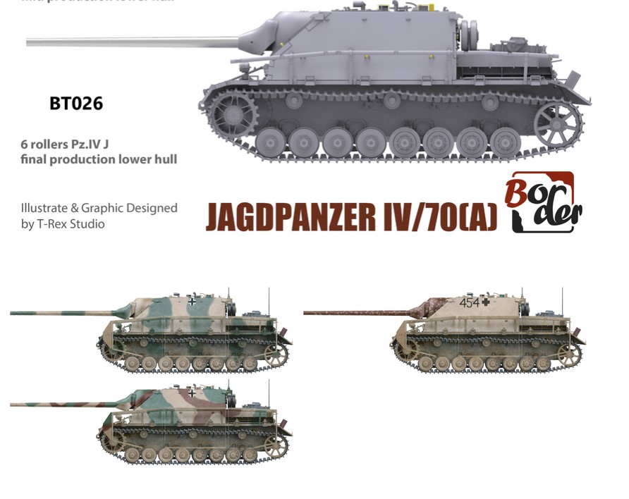1/35 Pz.Kpfw.Iv/70[A]Final - Border Model BT-026 Manufacturer: Border Model Availability: In stock SKU: Border Model BT-026 This Border Model IV/70(A) Final kit offers an accurate and detailed representation of one of Germany’s last tank destroyer designs of WWII. Old price: $74.99 Price: $50.00 Qty: Add to cart Custom wishlist OK Add to wishlist Email a friend Shares: Border Model Pz.Kpfw. IV/70(A) Final Version is a 1/35 scale plastic model kit depicting the late‑war German tank destroyer equipped with a long 7.5 cm gun mounted on a Panzer IV chassis. The kit features accurate late‑production details, sloped superstructure armor, and finely molded surface textures.\n\nHighlights: 1/35 scale Pz.Kpfw. IV/70(A) Final production configuration Long‑barreled 7.5 cm gun Accurate late‑war German design\n\nDetails: Manufacturer: Border Model SKU: BT026 Scale: 1/35 Type: Plastic Model Kit Era: WWII Skill Level: Advanced Products specifications Attribute name Attribute value Country Germany Sub Group Tank Destroyer Side Axis Vehicle Common Name Panzer IV, Pz.Kpfw.IV, Pz.Kpfw.IV/7[A] Vehicle Type Sd.Kfz. 162 Group Tanks Main Weapon 7.5 cm L/7 Used By Germany Scale 1/35 Model Production Year 2023 Product tags Axis (476) , Germany (662) , Pz.Kpfw.IV (28) , Panzer IV (25) , Tank Destroyer (23) , Sd.Kfz. 162 (4) , Tanks (220) , Pz.Kpfw.IV/7[A] (2) , 7.5 cm L/7 (2)