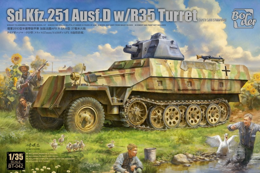 1/35 Sd.Kfz.251 Ausf.D with R35 Turret - Border Model BT-042 Manufacturer: Border Model Availability: In stock SKU: Border Model BT-042 This Border Model Sd.Kfz.251 conversion kit recreates a rare German field modification, making it an excellent centerpiece for late‑war dioramas. Old price: $84.99 Price: $48.00 Qty: Add to cart Custom wishlist OK Add to wishlist Email a friend Shares: Border Model Sd.Kfz.251 Ausf.D with R35 Turret is a 1/35 scale plastic model kit depicting a German halftrack modified with a captured French Renault R35 turret. This unusual field conversion reflects late‑war German reuse of captured equipment on the Eastern Front.\n\nHighlights: 1/35 scale Sd.Kfz.251 Ausf.D halftrack Captured R35 tank turret conversion Unique late‑war German modification Highly detailed hull and turret parts\n\nDetails: Manufacturer: Border Model SKU: BT042 Scale: 1/35 Type: Plastic Model Kit Era: WWII Skill Level: Advanced Products specifications Attribute name Attribute value Country Germany Sub Group Half-Track Group AFV Main Weapon 37 mm L/21 SA 18 Wars WWII Side Axis Vehicle Type Sd.Kfz. 251 Used By Britain, Commonwealth, Germany Scale 1/35 Model Production Year 2024 Product tags Axis (476) , Germany (662) , WWII (466) , Britain (171) , AFV (155) , Half-Track (21) , Commonwealth (35) , Sd.Kfz. 25137 mm L/21 SA 18 (1)