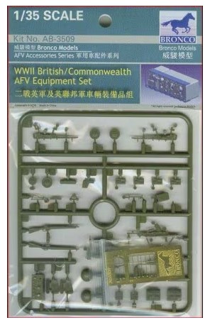 1/35 WWII British & Commonwealth AFV Equipment Set – Bronco Model AB3509 Manufacturer: Bronco Model Availability: In stock SKU: Bronco Model AB3509 This Bronco Model equipment set adds authentic British and Commonwealth stowage to armored vehicles and diorama scenes in 1/35 scale. Old price: $11.99 Price: $6.00 Qty: Add to cart Custom wishlist OK Add to wishlist Email a friend Shares: Bronco Model WWII British & Commonwealth AFV Equipment Set is a 1/35 scale plastic accessory kit designed to enhance Allied armored vehicles and dioramas. The set includes a wide variety of stowage items, tools, and battlefield equipment commonly used by British and Commonwealth forces during World War II.\n\nHighlights: 1/35 scale AFV equipment set British & Commonwealth WWII gear Ideal for vehicle stowage and dioramas Crisp plastic accessory detail\n\nDetails: Manufacturer: Bronco Model SKU: AB3509 Scale: 1/35 Type: Plastic Accessory Kit Era: WWII Skill Level: Beginner to Advanced Products specifications Attribute name Attribute value Country Britain Group Accessory Wars WWII Side Allies Used By Britain, Iraq, Lebanon, Russia, Yugoslavia Scale 1/35 Product tags Russia (259) , Lebanon (21) , Britain (171) , Yugoslavia (30) , AccessoryAllies (1) , IraqWWII (1)