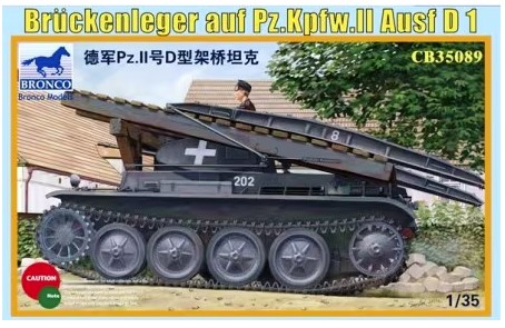 1/35 Brückenleger auf Panzer II Ausf.D1 – Bronco Model CB35089 Manufacturer: Bronco Model Availability: In stock SKU: Bronco Model CB35089 This Bronco Model Brückenleger kit allows accurate portrayal of German WWII engineering and bridge‑laying operations. Old price: $54.99 Price: $38.00 Qty: Add to cart Custom wishlist OK Add to wishlist Email a friend Shares: Bronco Model Brückenleger auf Panzer II Ausf.D1 depicts an engineering bridge‑laying vehicle mounted on a Panzer II chassis. This 1/35 scale plastic kit includes the bridge assembly and conversion details used for combat engineering operations.\n\nHighlights: 1/35 scale Panzer II bridge‑layer Combat engineering vehicle Based on Ausf.D1 chassis Unique battlefield support subject\n\nDetails: Manufacturer: Bronco Model SKU: CB35089 Scale: 1/35 Type: Plastic Model Kit Era: WWII Skill Level: Advanced Products specifications Attribute name Attribute value Country Germany Sub Group Light Tank Side Axis Vehicle Common Name Bruckenleger, Pz.Kpfw. II Vehicle Type Sd.Kfz. 121 Group Tanks Used By Germany Scale 1/35 Model Production Year 2011 Product tags Axis (476) , Germany (662) , Light Tank (71) , Pz.Kpfw. II (2) , Sd.Kfz. 121 (1) , Bruckenleger (1) , Tanks (220)