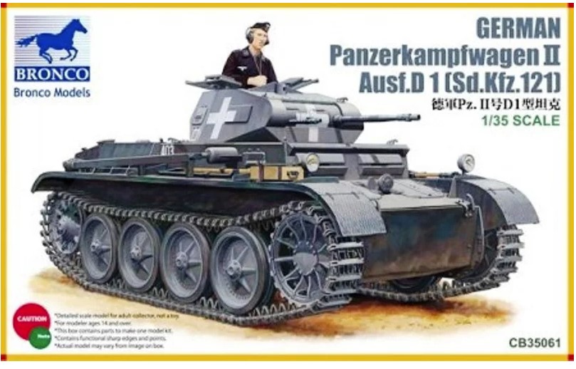 1/35 German Panzerkampfwagen II Ausf.D1 (Sd.Kfz.121) – Bronco Model CB35061 Manufacturer: Bronco Model Availability: In stock SKU: Bronco Model CB35061 This Bronco Model Panzer II Ausf.D1 kit accurately represents a rare German reconnaissance tank with distinctive engineering features. Old price: $51.99 Price: $35.00 Qty: Add to cart Custom wishlist OK Add to wishlist Email a friend Shares: Bronco Model Panzerkampfwagen II Ausf.D1 depicts an experimental fast reconnaissance variant of the Panzer II fitted with a torsion bar suspension. This 1/35 scale plastic model kit captures the distinctive hull shape, suspension layout, and early‑war German armored vehicle features.\n\nHighlights: 1/35 scale Panzer II Ausf.D1 High‑speed reconnaissance variant Unique suspension and hull design Accurate early‑war German armor\n\nDetails: Manufacturer: Bronco Model SKU: CB35061 Scale: 1/35 Type: Plastic Model Kit Era: WWII Skill Level: Advanced Products specifications Attribute name Attribute value Country Germany Sub Group Light Tank Wars WWII Side Axis Vehicle Common Name Panzer II, Pz.Kpfw. II Vehicle Type Sd.kfz.121 Group Tanks Used By America, Germany Scale 1/35 Model Production Year 2011 Product tags Axis (476) , Germany (662) , WWII (466) , Light Tank (71) , America (176) , Panzer II (2) , Sd.kfz.121 (7) , Pz.Kpfw. II (2) , Tanks (220)
