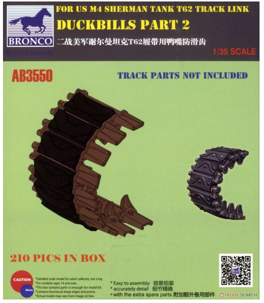 1/35 Duckbills for U.S. M4 Sherman T62 Tracks Part 2 – Bronco Model AB3550 Manufacturer: Bronco Model Availability: In stock SKU: Bronco Model AB3550 This Bronco Model duckbill set accurately reproduces additional Sherman track extensions used during late WWII operations. Old price: $11.99 Price: $6.00 Qty: Add to cart Custom wishlist OK Add to wishlist Email a friend Shares: Bronco Model Duckbills Part 2 provides additional track end connectors specifically designed for U.S. Sherman tanks fitted with T62 track links. These 1/35 scale plastic parts add accurate late‑war traction improvements to Sherman builds.\n\nHighlights: 1/35 scale Sherman duckbills Designed for T62 track links Late‑war U.S. Army detail Cleanly molded plastic parts\n\nDetails: Manufacturer: Bronco Model SKU: AB3550 Scale: 1/35 Type: Plastic Detail Set Era: WWII Skill Level: Intermediate Products specifications Attribute name Attribute value Country America Group Accessory Wars Spanish Civil War, WWII, Soviet–Japanese border conflicts, Winter War (1939) Side Allies Vehicle Common Name Sherman Sub Group Tracks, Track Set Vehicle Type M4 Sherman Used By America, Finland, Germany, Russia, Spain Scale 1/35 Model Production Year 2016 Product tags Germany (662) , America (176) , Allies (309) , Russia (259) , Finland (71) , Accessory (10) , Spain (46) , Tracks (5) , M4 Sherman (2) , ShermanWWII (2)