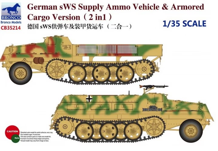 1/35 German sWS Supply & Armored Cargo Vehicle 2‑in‑1 – Bronco Model CB35214 Manufacturer: Bronco Model Availability: In stock SKU: Bronco Model CB35214 This Bronco Model sWS kit offers great flexibility for German late‑war logistics modeling. Old price: $59.99 Price: $50.00 Qty: Add to cart Custom wishlist OK Add to wishlist Email a friend Shares: Bronco Model sWS Supply Vehicle 2‑in‑1 kit allows construction of either an open supply carrier or an armored cargo variant. This versatile 1/35 scale kit depicts German heavy logistics vehicles used late in WWII.\n\nHighlights: 1/35 scale German sWS vehicle 2‑in‑1 supply or armored cargo build Heavy logistics platform Late‑war configuration\n\nDetails: Manufacturer: Bronco Model SKU: CB35214 Scale: 1/35 Type: Plastic Model Kit Era: WWII Skill Level: Advanced Products specifications Attribute name Attribute value Country Germany Sub Group Half-Track Group AFV Wars WWII Side Axis Vehicle Common Name Schwerer Wehrmachtschlepper, sWS Vehicle Type Sd.Kfz. 4 Used By Germany, Russia Scale 1/35 Model Production Year 2016 Product tags Axis (476) , Germany (662) , WWII (466) , Russia (259) , AFV (155) , Half-Track (21) , sWS (3) , Schwerer Wehrmachtschlepper (2) , Sd.Kfz. 4 (1)