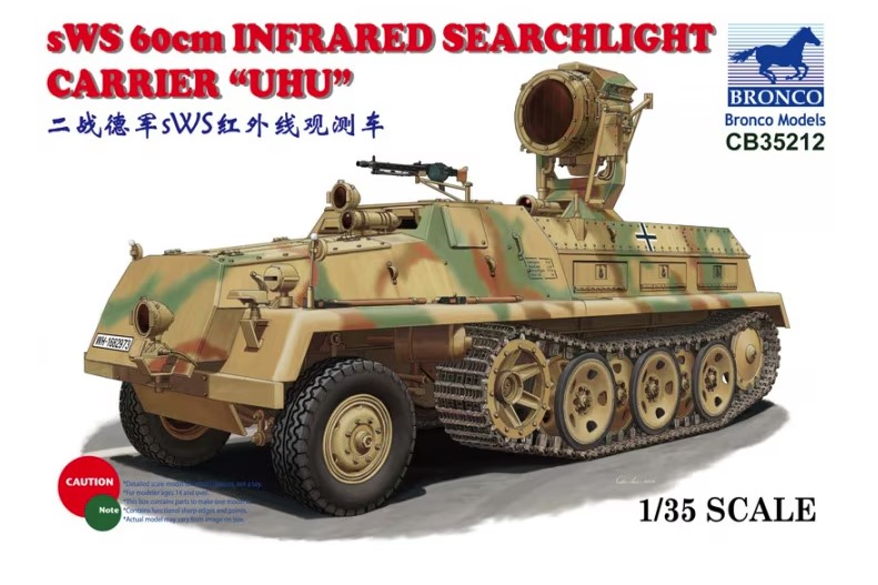 1/35 sWS Infrared Searchlight Carrier ‘UHU’ – Bronco Model CB35212 Manufacturer: Bronco Model Availability: In stock SKU: Bronco Model CB35212 This Bronco Model UHU kit recreates a rare German late‑war infrared illumination vehicle. Old price: $64.99 Price: $55.00 Qty: Add to cart Custom wishlist OK Add to wishlist Email a friend Shares: Bronco Model sWS ‘UHU’ Infrared Searchlight Carrier depicts a late‑war German night‑fighting support vehicle. This 1/35 scale kit features the large infrared searchlight mounted on the Schwerer Wehrmachtschlepper chassis.\n\nHighlights: 1/35 scale German IR support vehicle sWS carrier with UHU searchlight Late‑war night‑fighting technology Unique and rare subject\n\nDetails: Manufacturer: Bronco Model SKU: CB35212 Scale: 1/35 Type: Plastic Model Kit Era: WWII Skill Level: Advanced Products specifications Attribute name Attribute value Country Germany Sub Group Half-Track Group AFV Wars Cambodian Civil War, Cambodian–Vietnamese War, First Indochina War, Korean War, Vietnam War, WWII Side Axis Vehicle Common Name Schwerer Wehrmachtschlepper, sWS Vehicle Type Sd.Kfz. 4/1 Used By China, Germany, Korea, Russia, Vietnam Scale 1/35 Model Production Year 2015 Product tags Axis (476) , Germany (662) , WWII (466) , Russia (259) , AFV (155) , Half-Track (21) , Sd.Kfz. 4/1 (2) , sWS (3) , Schwerer Wehrmachtschlepper (2) , Korea (3) , Vietnam (5)