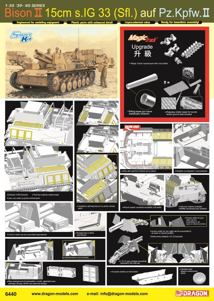 1/35 Bison II 15cm s.IG 33 auf Pz.Kpfw. II w/Magic Track – Dragon 6440 Manufacturer: Dragon Models Availability: In stock SKU: Dragon Models 6440 This Dragon kit recreates an improvised early German assault gun with heavy firepower. Old price: $79.99 Price: $70.00 Qty: Add to cart Custom wishlist OK Add to wishlist Email a friend Shares: Dragon Bison II mounts the 15cm s.IG 33 heavy infantry gun on a Panzer II chassis. This 1/35 scale kit includes Magic Track links, an open fighting compartment, and accurate early assault gun detailing.\n\nHighlights: 1/35 scale Bison II assault gun 15cm s.IG 33 infantry gun Includes Magic Track links Open‑top fighting compartment\n\nDetails: Manufacturer: Dragon Models SKU: 6440 Scale: 1/35 Type: Plastic Model Kit Era: WWII Skill Level: Advanced Products specifications Attribute name Attribute value Country Germany Sub Group Self-propelled Gun Group AFV Main Weapon 15 cm sIG 33 Wars Korean War, WWII Side Axis Vehicle Common Name Bison II Vehicle Type Sd.kfz.124 Used By America, Britain, Germany, Russia Scale 1/35 Model Production Year 2025 Product tags Axis (476) , Germany (662) , WWII (466) , America (176) , Russia (259) , Self-propelled Gun (68) , Britain (171) , AFV (155) , Sd.kfz.124 (1) , Bison II15 cm sIG 33 (1)
