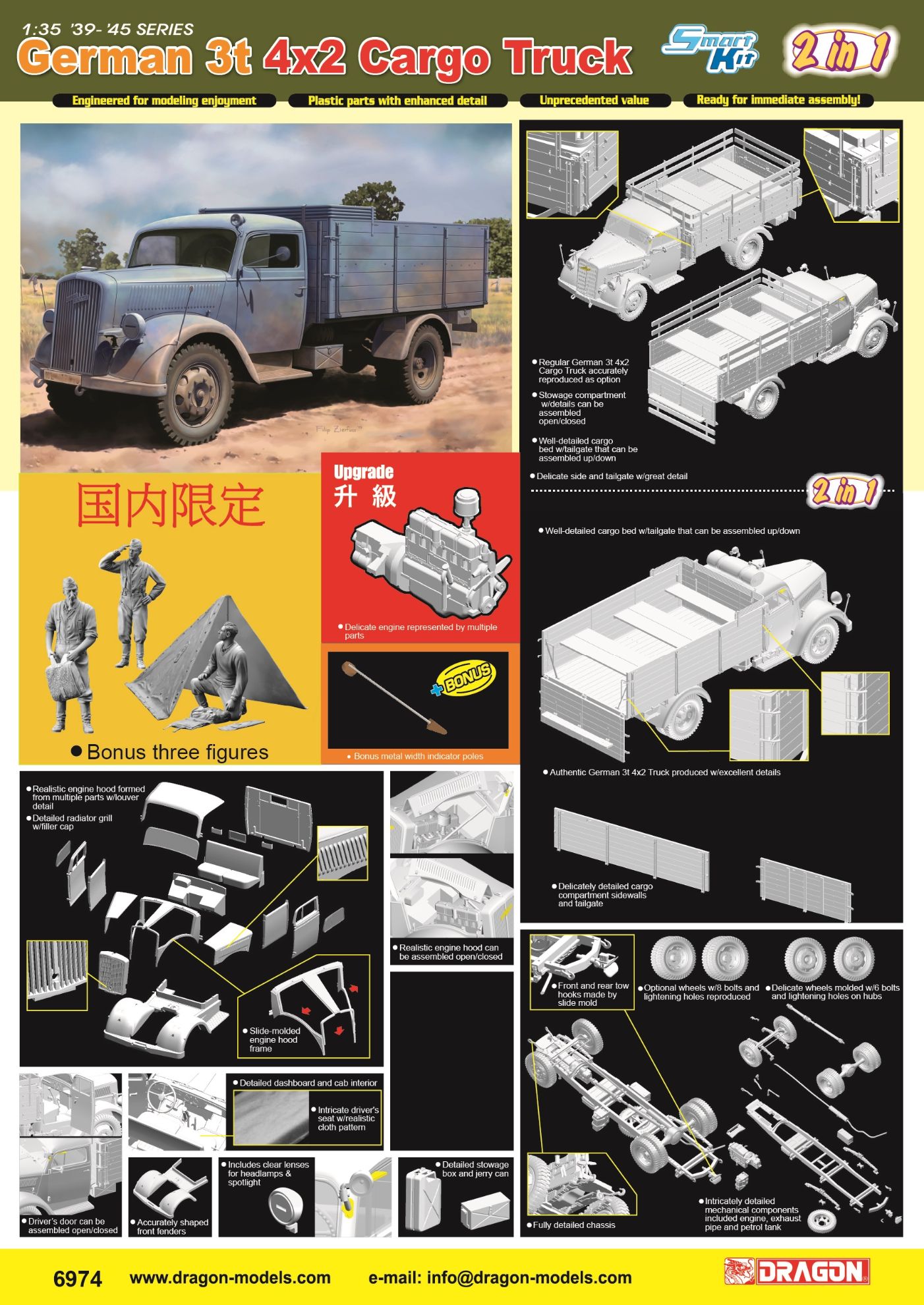 1/35 German 3t 4x2 Cargo Truck 2‑in‑1 – Dragon 6974 Manufacturer: Dragon Models Availability: In stock SKU: Dragon Models 6974 This Dragon truck kit enables accurate depiction of German transport and supply operations. Old price: $79.99 Price: $50.00 Qty: Add to cart Custom wishlist OK Add to wishlist Email a friend Shares: Dragon German 3‑ton 4x2 Cargo Truck 2‑in‑1 offers multiple configuration options for German logistical vehicles. This 1/35 scale kit features detailed chassis, cab, and cargo bed options.\n\nHighlights: 1/35 scale German cargo truck 2‑in‑1 build options WWII logistics vehicle Detailed chassis and cab\n\nDetails: Manufacturer: Dragon Models SKU: 6974 Scale: 1/35 Type: Plastic Model Kit Era: WWII Skill Level: Advanced Products specifications Attribute name Attribute value Country Germany Sub Group Cargo Truck, Truck Group Transport Wars WWII Side Axis Vehicle Common Name Opel, Opel Blitz Vehicle Type Opel Blitz 3.6 Used By America, Germany, Russia Scale 1/35 Model Production Year 2022 Product tags Axis (476) , Germany (662) , WWII (466) , America (176) , Russia (259) , Transport (150) , Opel Blitz 3.6 (2) , Opel (2) , Cargo Truck (19) , Opel Blitz (1)