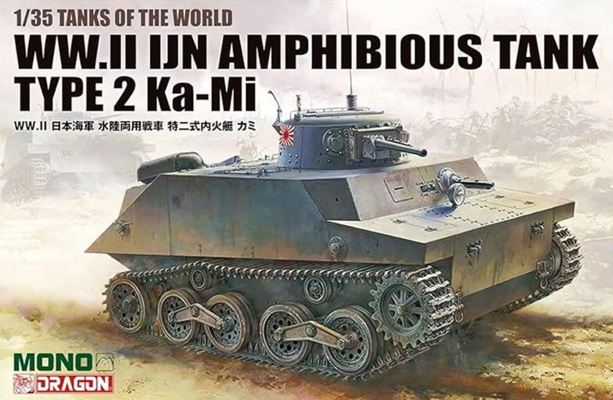 1/35 IJN Type 2 Ka‑Mi Amphibious Tank Combat Version – Dragon MD008 Manufacturer: Dragon Models Availability: In stock SKU: Dragon Models MD008 This Dragon kit accurately represents Japanese amphibious armored fighting vehicles used in the Pacific. Old price: $74.99 Price: $60.00 Qty: Add to cart Custom wishlist OK Add to wishlist Email a friend Shares: Dragon IJN Type 2 Ka‑Mi Amphibious Tank Combat Version is a 1/35 scale plastic model depicting the Imperial Japanese Navy’s amphibious tank. The kit features detachable flotation pontoons and accurate combat configuration.\n\nHighlights: 1/35 scale IJN Ka‑Mi amphibious tank Detachable flotation pontoons Pacific Theater subject Unique naval armor design\n\nDetails: Manufacturer: Dragon Models SKU: MD008 Scale: 1/35 Type: Plastic Model Kit Era: WWII Skill Level: Advanced Products specifications Attribute name Attribute value Country Japan Sub Group Amphibious Vehicle Main Weapon Type 97 7.7 mm MG Wars WWII Side Axis Vehicle Common Name Type 2 (Ka-Mi), Type 2 Ka-Mi Vehicle Type Type 2 (Ka-Mi) Group Tanks Used By Japan, Russia Scale 1/35 Model Production Year 2025 Product tags Axis (476) , WWII (466) , Russia (259) , Amphibious Vehicle (12) , Japan (16) , Type 2 (Ka-Mi) (1) , Tanks (220) , Type 2 Ka-MiType 97 7.7 mm MG (1)