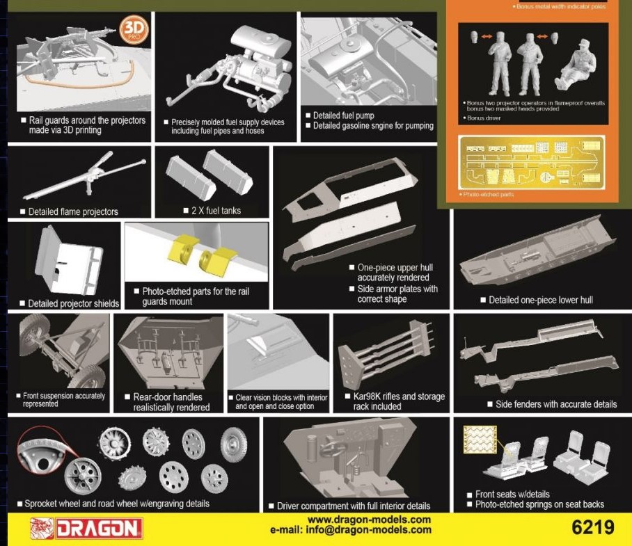 1/35 Sd.Kfz.251/16 Ausf.D Flammpanzerwagen – Dragon 6219 Manufacturer: Dragon Models Availability: In stock SKU: Dragon Models 6219 This Dragon flamethrower halftrack kit recreates a terrifying German close-assault vehicle with excellent mechanical realism. Old price: $69.99 Price: $60.00 Qty: Add to cart Custom wishlist OK Add to wishlist Email a friend Shares: Dragon Sd.Kfz.251/16 Ausf.D Flammpanzerwagen is a 1/35 scale plastic model kit depicting the German halftrack converted into a flamethrower vehicle. The kit includes flamethrower projectors, fuel tanks, and accurate Ausf.D hull detail.\n\nHighlights: 1/35 scale Sd.Kfz.251/16 halftrack Flamethrower assault configuration Ausf.D hull variant Detailed flame equipment\n\nDetails: Manufacturer: Dragon Models SKU: 6219 Scale: 1/35 Type: Plastic Model Kit Era: WWII Skill Level: Advanced Products specifications Attribute name Attribute value Country Germany Wars WWII Side Axis Group Tanks Used By Britain, Canada, Germany, Italy, Netherlands Scale 1/35 Model Production Year 2025 Product tags Germany (662) , WWII (466) , Britain (171) , Italy (91) , Canada (14) , Netherlands (1) , TanksAxis (12)