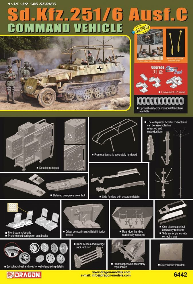 1/35 Sd.Kfz.251/6 Ausf.C Command Vehicle – Dragon 6442 Manufacturer: Dragon Models Availability: In stock SKU: Dragon Models 6442 This Dragon command halftrack kit adds leadership and coordination realism to German formations. Old price: $79.99 Price: $65.00 Qty: Add to cart Custom wishlist OK Add to wishlist Email a friend Shares: Dragon Sd.Kfz.251/6 Ausf.C is a 1/35 scale plastic model kit depicting the German armored command halftrack. The vehicle features map tables, radio equipment, and command fittings used by штаб units.\n\nHighlights: 1/35 scale Sd.Kfz.251/6 command halftrack Ausf.C early hull version Detailed interior with maps and radios Ideal command diorama vehicle\n\nDetails: Manufacturer: Dragon Models SKU: 6442 Scale: 1/35 Type: Plastic Model Kit Era: WWII Skill Level: Advanced Products specifications Attribute name Attribute value Country Germany Sub Group Command/Radio Vehicle Group AFV Wars Korean War, WWII Side Axis Vehicle Type Sd.Kfz. 251/6 Used By America, Britain, Germany, Russia Scale 1/35 Model Production Year 2024 Product tags Axis (476) , Germany (662) , WWII (466) , America (176) , Russia (259) , Britain (171) , AFV (155) , Command/Radio Vehicle (16) , Sd.Kfz. 251/6 (2)