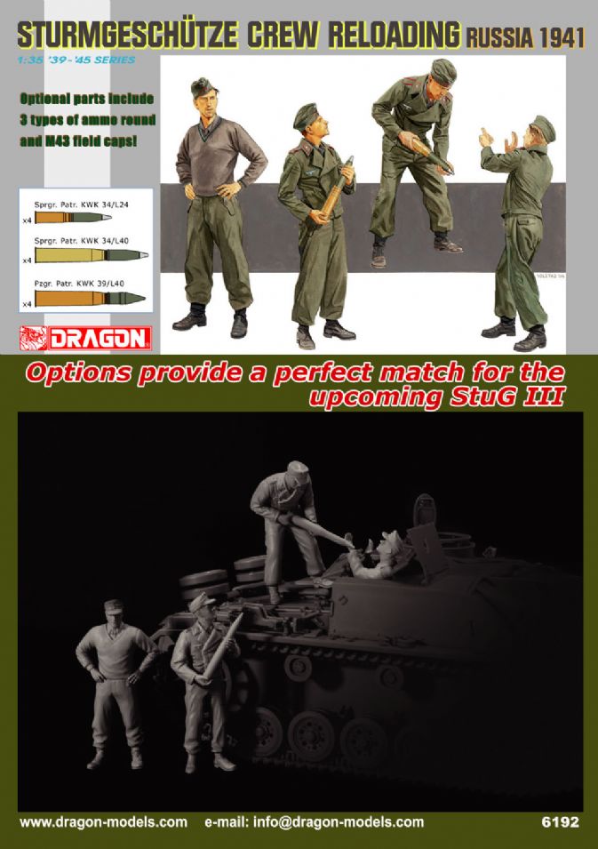 1/35 Sturmgeschütz Crew Reloading Russia 1941 – Dragon 6192 Manufacturer: Dragon Models Availability: In stock SKU: Dragon Models 6192 This Dragon crew set enhances StuG assault gun models with realistic operational support detail. Old price: $17.99 Price: $12.00 Qty: Add to cart Custom wishlist OK Add to wishlist Email a friend Shares: Dragon Sturmgeschütz Crew Reloading Russia 1941 is a 1/35 scale plastic figure set showing German assault gun crew members resupplying and reloading ammunition during early Eastern Front combat. The figures are designed to complement StuG III vehicle displays.\n\nHighlights: 1/35 scale StuG crew figures Reloading and support poses Russia 1941 campaign Ideal vehicle interaction set\n\nDetails: Manufacturer: Dragon Models SKU: 6192 Scale: 1/35 Type: Plastic Figure Set Era: WWII Skill Level: Intermediate Products specifications Attribute name Attribute value Country Germany Side Axis Used By Germany Scale 1/35 Model Production Year 2006
