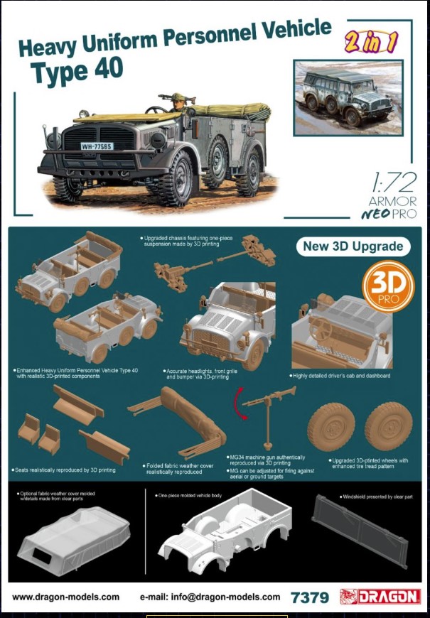 1/72 Heavy Uniform Personnel Carrier Type 40 1/72 – SKU 7379 Manufacturer: Dragon Models Availability: In stock SKU: Dragon Models 7379 This Dragon kit provides an accurate small‑scale Japanese personnel carrier for WWII collections. Old price: $29.99 Price: $20.00 Qty: Add to cart Custom wishlist OK Add to wishlist Email a friend Shares: Dragon Type 40 Heavy Uniform Personnel Vehicle is a 1/72 scale plastic model kit depicting Japanese WWII troop transport vehicles. This compact kit provides fine detail at small scale.\n\nHighlights: 1/72 scale Japanese personnel carrier WWII transport vehicle Compact highly detailed kit Ideal for small‑scale collections\n\nDetails: Manufacturer: Dragon Models SKU: 7379 Scale: 1/72 Type: Plastic Model Kit Era: WWII Skill Level: Intermediate Products specifications Attribute name Attribute value Country Germany Sub Group Jeep Group Transport Wars WWII Side Axis Vehicle Common Name Krupp Protze Vehicle Type Kfz. 7 Used By Germany Scale 1/72 Model Production Year 2025 Product tags Axis (476) , Germany (662) , WWII (466) , Transport (150) , Jeep (11) , Krupp Protze (3) , Kfz. 7 (6)