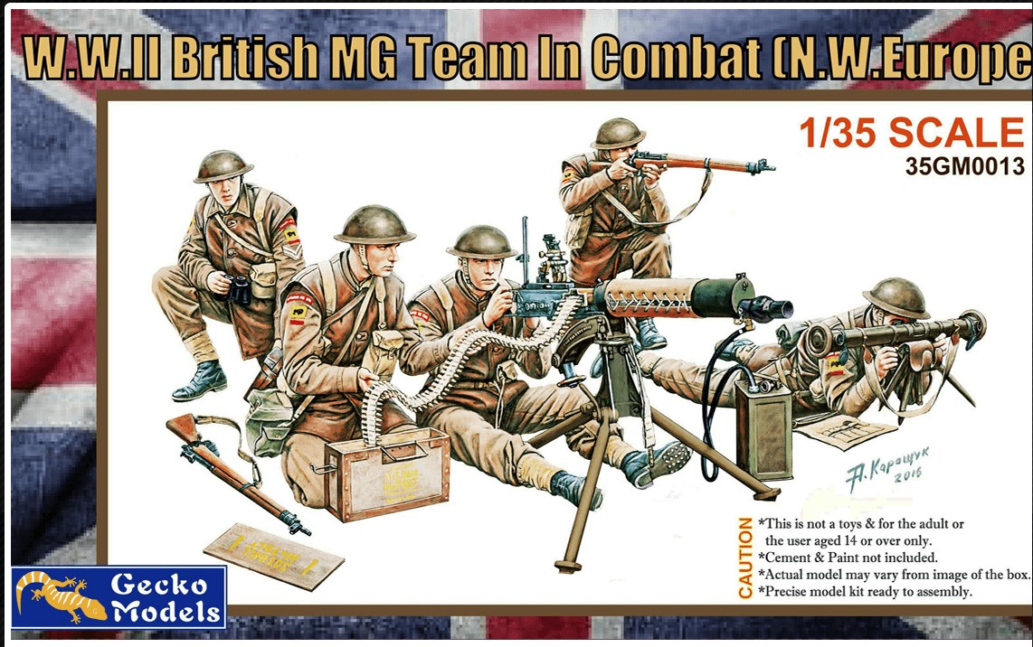 1/35 WWII British MG Team in Combat – Gecko 35GM0013 Manufacturer: Gecko Availability: In stock SKU: Gecko 35GM0013 This Gecko British MG Team set adds authentic firepower and motion to WWII dioramas, ideal for European battlefield scenes. Old price: $37.99 Price: $25.00 Qty: Add to cart Custom wishlist OK Add to wishlist Email a friend Shares: Gecko WWII British MG Team in Combat is a 1/35 scale plastic figure kit depicting a British infantry machine‑gun team engaged in frontline combat during World War II. The set includes dynamic firing and support poses with period‑correct uniforms, personal equipment, and weapons suitable for European theater dioramas.\n\nHighlights: 1/35 scale British infantry figure set WWII machine‑gun team in action Dynamic combat poses Accurate uniforms and equipment\n\nDetails: Manufacturer: Gecko Models SKU: GECKO-013 Scale: 1/35 Type: Plastic Figure Set Era: WWII Skill Level: Intermediate Products specifications Attribute name Attribute value Country Britain Side Allies Used By Britain Scale 1/35 Model Production Year 2017