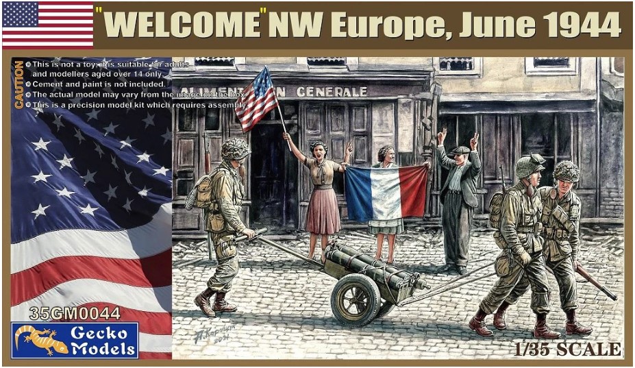 1/35 Welcome NW Europe June 1944 Diorama Set – Gecko 35GM0044 Manufacturer: Gecko Availability: In stock SKU: Gecko 35GM0044 This Gecko diorama set captures the human side of liberation during the summer of 1944. Old price: $34.99 Price: $28.00 Qty: Add to cart Custom wishlist OK Add to wishlist Email a friend Shares: Gecko Welcome NW Europe June 1944 is a 1/35 scale plastic figure set depicting Allied troops interacting with civilians during the liberation of Western Europe. The figures capture emotional and historical moments immediately following D‑Day.\n\nHighlights: 1/35 scale WWII diorama figures Northwest Europe June 1944 Civilian and Allied troop interaction Story‑driven vignette set\n\nDetails: Manufacturer: Gecko Models SKU: GECKO-044 Scale: 1/35 Type: Plastic Figure/Diorama Set Era: WWII Skill Level: Beginner to Intermediate Products specifications Attribute name Attribute value Country America Side Allies Used By America Scale 1/35 Model Production Year 2023