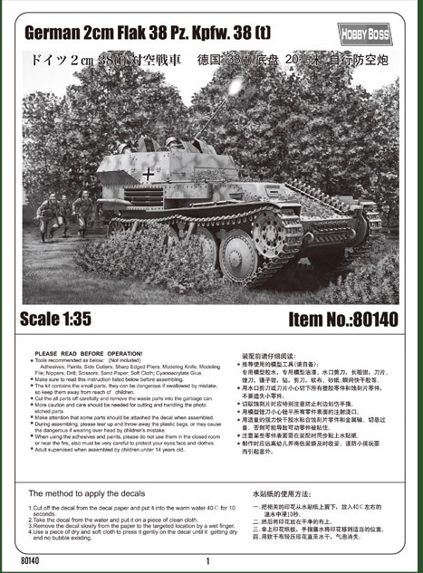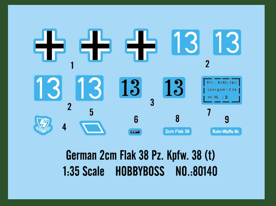 1/35 Flakpanzer 38(t) with 2cm Flak 38 – HobbyBoss 80140 Manufacturer: HobbyBoss Availability: In stock SKU: Hobby Boss 80140 This HobbyBoss Flakpanzer kit represents Germany’s light mobile AA defense vehicle. Old price: $59.99 Price: $40.00 Qty: Add to cart Custom wishlist OK Add to wishlist Email a friend Shares: HobbyBoss Flakpanzer 38(t) is a 1/35 scale plastic model kit depicting the light anti‑aircraft tank mounting the 2cm Flak 38 on the 38(t) chassis. This vehicle provided mobile air defense for German units.\n\nHighlights: 1/35 scale Flakpanzer 38(t) 2cm Flak 38 AA gun Open‑top fighting compartment Mobile air‑defense platform\n\nDetails: Manufacturer: HobbyBoss SKU: 80140 Scale: 1/35 Type: Plastic Model Kit Era: WWII Skill Level: Advanced Products specifications Attribute name Attribute value Country Germany Sub Group Self-propelled Gun Group AFV Main Weapon 2 cm Flak 38 Wars WWII Side Axis Vehicle Common Name Panzer 38(t) Vehicle Type Flakpanzer Pz.Kpfw.38 (t) Used By Germany, Russia Scale 1/35 Model Production Year 2016 Product tags Axis (476) , Germany (662) , WWII (466) , Russia (259) , Self-propelled Gun (68) , AFV (155) , Flakpanzer Pz.Kpfw.38 (t) (1) , Panzer 38(t)2 cm Flak 38 (1)