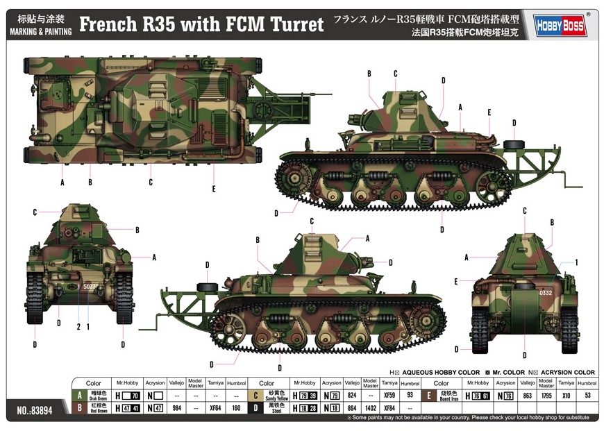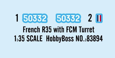 1/35 French R39 Light Tank with FCM Turret – HobbyBoss 83894 Manufacturer: HobbyBoss Availability: In stock SKU: Hobby Boss 83894 This HobbyBoss kit depicts one of the more unusual French armored vehicle configurations. Old price: $64.99 Price: $42.00 Qty: Add to cart Custom wishlist OK Add to wishlist Email a friend Shares: HobbyBoss French R39 with FCM Turret is a 1/35 scale plastic model kit depicting a rare turret variant fitted to the R39 chassis.\n\nHighlights: 1/35 scale French R39 tank Equipped with FCM turret Rare early WWII configuration Unique French armor variant\n\nDetails: Manufacturer: HobbyBoss SKU: 83894 Scale: 1/35 Type: Plastic Model Kit Era: WWII Skill Level: Advanced Products specifications Attribute name Attribute value Country France Sub Group Light Tank Main Weapon 37 mm gun Side Allies Vehicle Common Name Pz.Kpf.Wg. 35R 731(f), R35, Renault R4 Vehicle Type Renault R35 Group Tanks Used By France Scale 1/35 Model Production Year 2022 Product tags Light Tank (71) , Allies (309) , France (69) , 37 mm Gun (3) , Renault R35 (4) , R35 (4) , Pz.Kpf.Wg. 35R 731(f) (3) , Tanks (220) , Renault R4 (2)