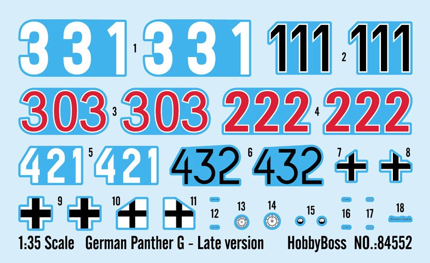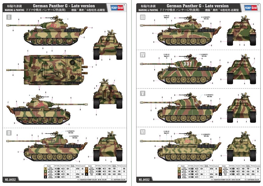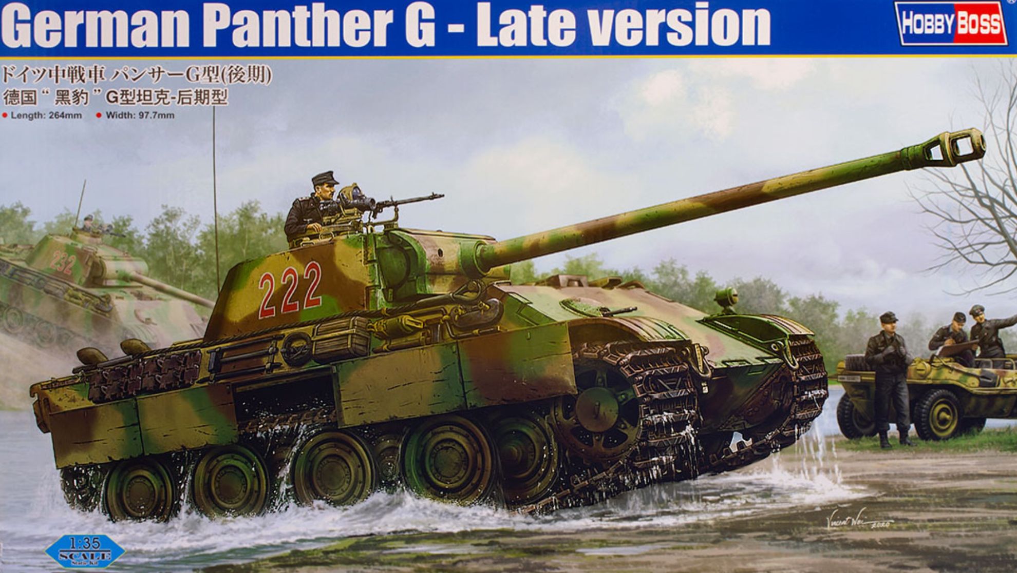 1/35 German Panther Ausf.G Late Version – HobbyBoss 84552 Manufacturer: HobbyBoss Availability: In stock SKU: Hobby Boss 84552 This HobbyBoss Panther G Late kit captures the definitive wartime form of Germany’s premier medium tank. Old price: $74.99 Price: $52.00 Qty: Add to cart Custom wishlist OK Add to wishlist Email a friend Shares: HobbyBoss German Panther Ausf.G Late Version is a 1/35 scale plastic model kit representing the final wartime production variant of Germany’s most capable medium tank. The kit includes late‑production details and simplified fittings.\n\nHighlights: 1/35 scale Panther Ausf.G Late‑production configuration WWII German medium tank Accurate hull and turret detailing\n\nDetails: Manufacturer: HobbyBoss SKU: 84552 Scale: 1/35 Type: Plastic Model Kit Era: WWII Skill Level: Advanced Products specifications Attribute name Attribute value Country Germany Sub Group Medium Tank Wars WWII Side Axis Vehicle Common Name Panther, PzKpfw V Ausf.G Vehicle Type Sd.Kfz.171 Group Tanks Main Weapon 75 mm KwK 42 L/7 tank gun Used By Germany Scale 1/35 Model Production Year 2022 Product tags Axis (476) , Germany (662) , WWII (466) , Medium Tank (68) , Sd.Kfz.171 (2) , Tanks (220) , PzKpfw V Ausf.GPanther (2) , 75 mm KwK 42 L/7 tank gun (5)