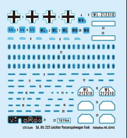 1/35 Sd.Kfz.223 Leichter Panzerspähwagen Funk – HobbyBoss 82443 Manufacturer: HobbyBoss Availability: In stock SKU: Hobby Boss 82443 This HobbyBoss Sd.Kfz.223 kit portrays a vital German reconnaissance and communications vehicle. Old price: $44.99 Price: $30.00 Qty: Add to cart Custom wishlist OK Add to wishlist Email a friend Shares: HobbyBoss Sd.Kfz.223 Funk is a 1/35 scale plastic model kit depicting the radio/command variant of the Sd.Kfz.222 family. The model includes antenna fittings and internal layout appropriate to communications roles.\n\nHighlights: 1/35 scale Sd.Kfz.223 radio car German command/recon variant Prominent antenna array Accurate hull and fittings\n\nDetails: Manufacturer: HobbyBoss SKU: 82443 Scale: 1/35 Type: Plastic Model Kit Era: WWII Skill Level: Intermediate Products specifications Attribute name Attribute value Country Germany Sub Group Command/Radio Vehicle Group AFV Main Weapon 7.92 mm MG-34 Wars WWII Side Axis Vehicle Common Name Leichter Panzerspahwagen Funk Vehicle Type Sd.Kfz. 223 Used By Germany, Italy Scale 1/35 Model Production Year 2010 Product tags Axis (476) , Germany (662) , WWII (466) , AFV (155) , Command/Radio Vehicle (16) , Italy (91) , Sd.Kfz. 223 (1) , Leichter Panzerspahwagen Funk7.92 mm MG-34 (1)
