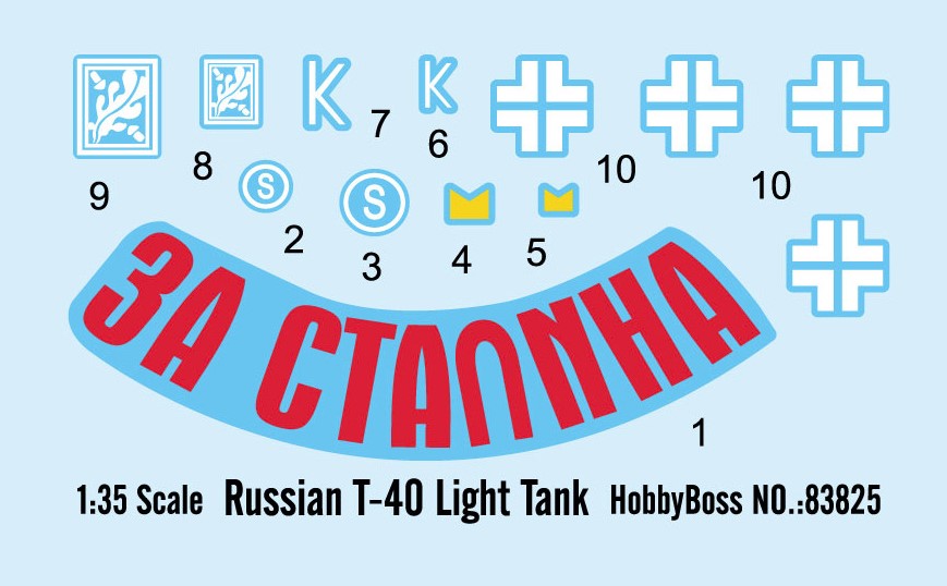 1/35 Russian T‑40 Light Tank – HobbyBoss 83825 Manufacturer: HobbyBoss Availability: In stock SKU: Hobby Boss 83825 This HobbyBoss T‑40 kit captures the evolution of Soviet amphibious light tanks. Old price: $64.99 Price: $42.00 Qty: Add to cart Custom wishlist OK Add to wishlist Email a friend Shares: HobbyBoss Russian T‑40 Light Tank is a 1/35 scale plastic model kit depicting an amphibious reconnaissance tank used by the Red Army during the early stages of WWII.\n\nHighlights: 1/35 scale T‑40 light tank Amphibious reconnaissance role Early‑war Soviet armor Accurate hull and turret detail\n\nDetails: Manufacturer: HobbyBoss SKU: 83825 Scale: 1/35 Type: Plastic Model Kit Era: WWII Skill Level: Intermediate Products specifications Attribute name Attribute value Country Russia Sub Group Amphibious Vehicle Main Weapon 12.7 mm DShK machine gun Wars WWII Side Allies Group Tanks Vehicle Common Name Pz.Kpfw. T-4(r) Vehicle Type T-4 Used By America, Russia Scale 1/35 Model Production Year 2015 Product tags WWII (466) , America (176) , Allies (309) , Russia (259) , Amphibious Vehicle (12) , Tanks (220) , T-4 (1) , Pz.Kpfw. T-4(r)12.7 mm DShK machine gun (1)